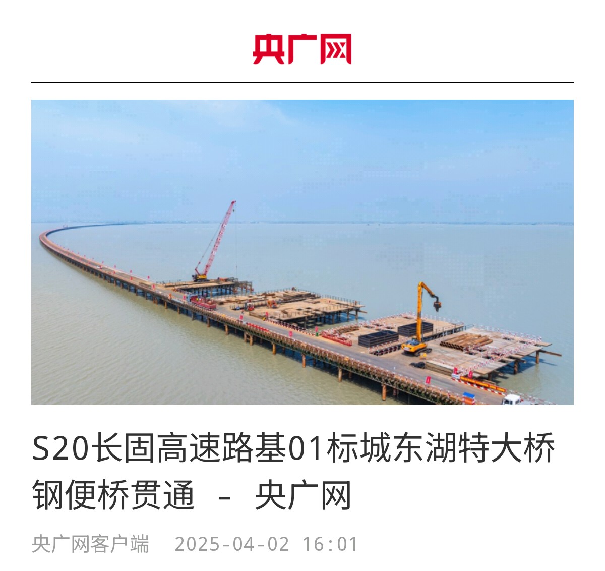 【央媒聚焦】央广网等主流媒体关注报道S20长固高速路基01标城东湖特大桥钢便桥贯通