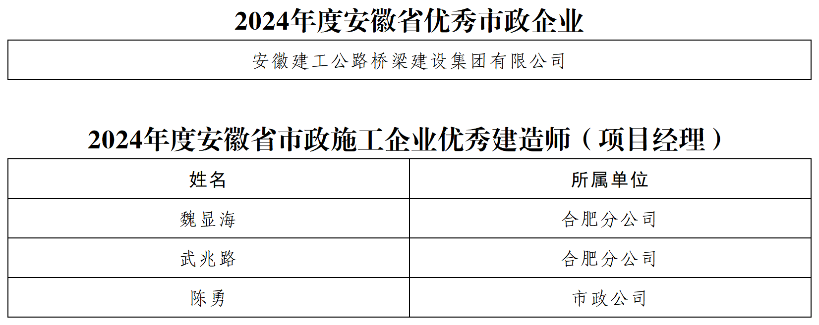 近日,从安徽省市政工程协会传来喜讯,公司荣获“2024年度安徽省优秀市政施工企业”称号,魏显海、武兆路、陈勇被评为“优秀建造师”。
