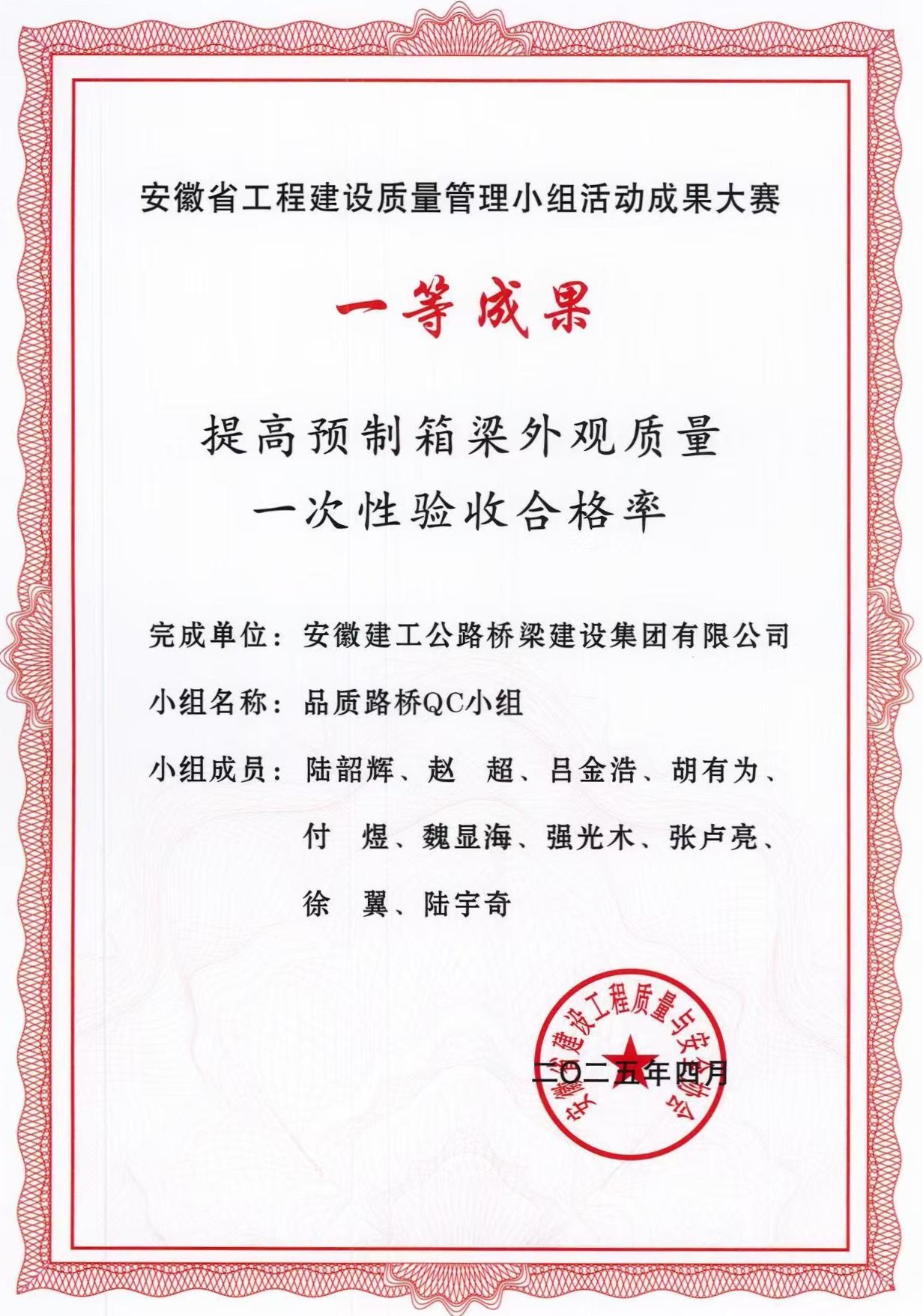 党支部牵头组建“品质路桥”QC小组,聚焦预制箱梁外观质量痛点,对材料管理实行原材料进场双检,针对性开展关键材料性能试验;预制工艺严控模板拼装精度,优化混凝土振捣方式。改进后,预制箱梁外观合格率从89.67%提升至95.44%,每片修饰时间缩短2小时。成果《提高预制箱梁外观质量一次验收合格率》获安徽省QC成果一等奖,以“红色匠心”护航工程品质。