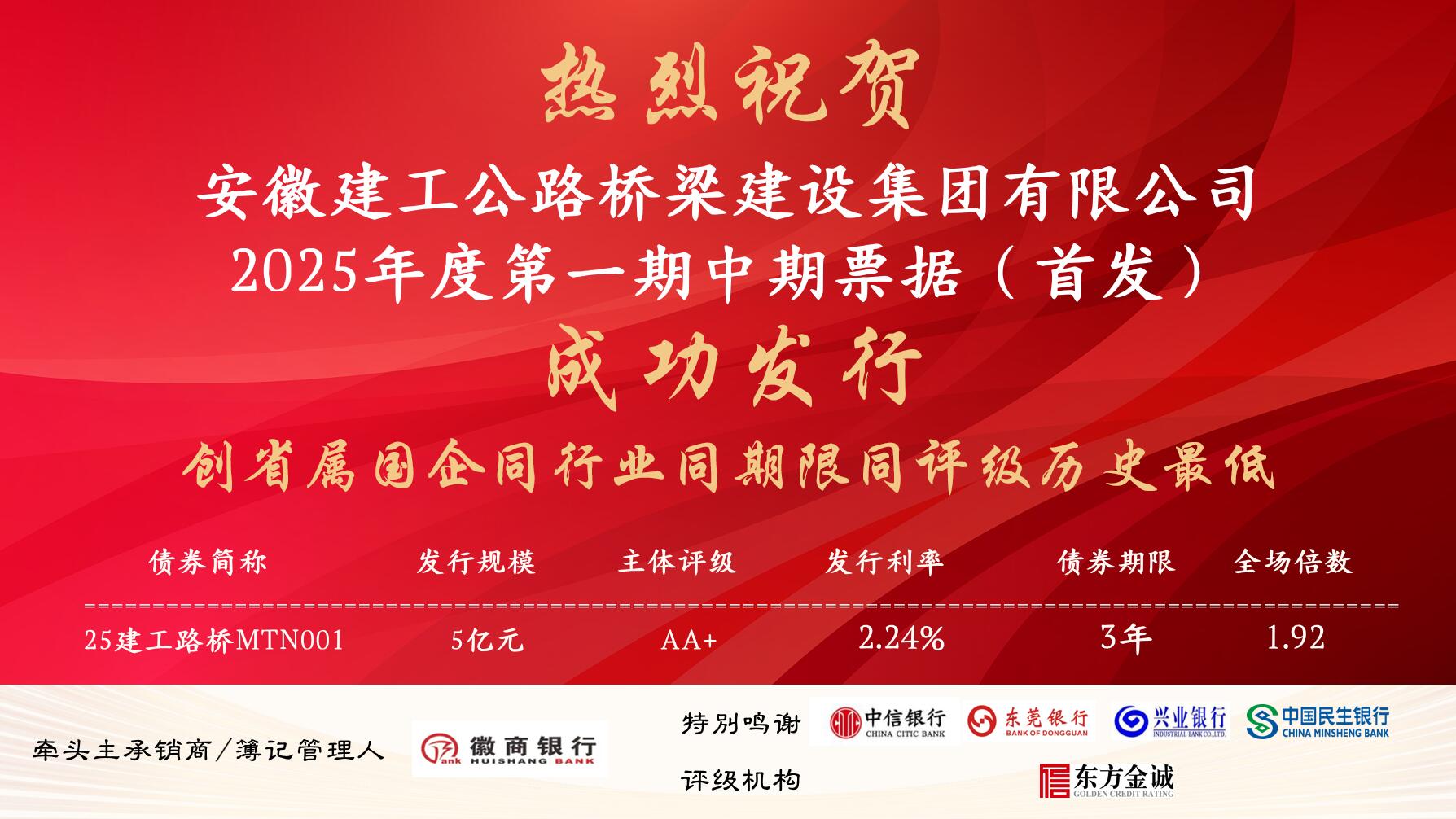 本次发行规模达人民币5亿元,期限3年,凭借卓越的市场认可度,实现高达1.92倍的认购倍数,最终票面利率锁定为2.24%。这一亮眼成绩不仅显著优于市场预期,更一举创下安徽省属建筑施工企业同期限、同评级债券的历史最低利率水平!