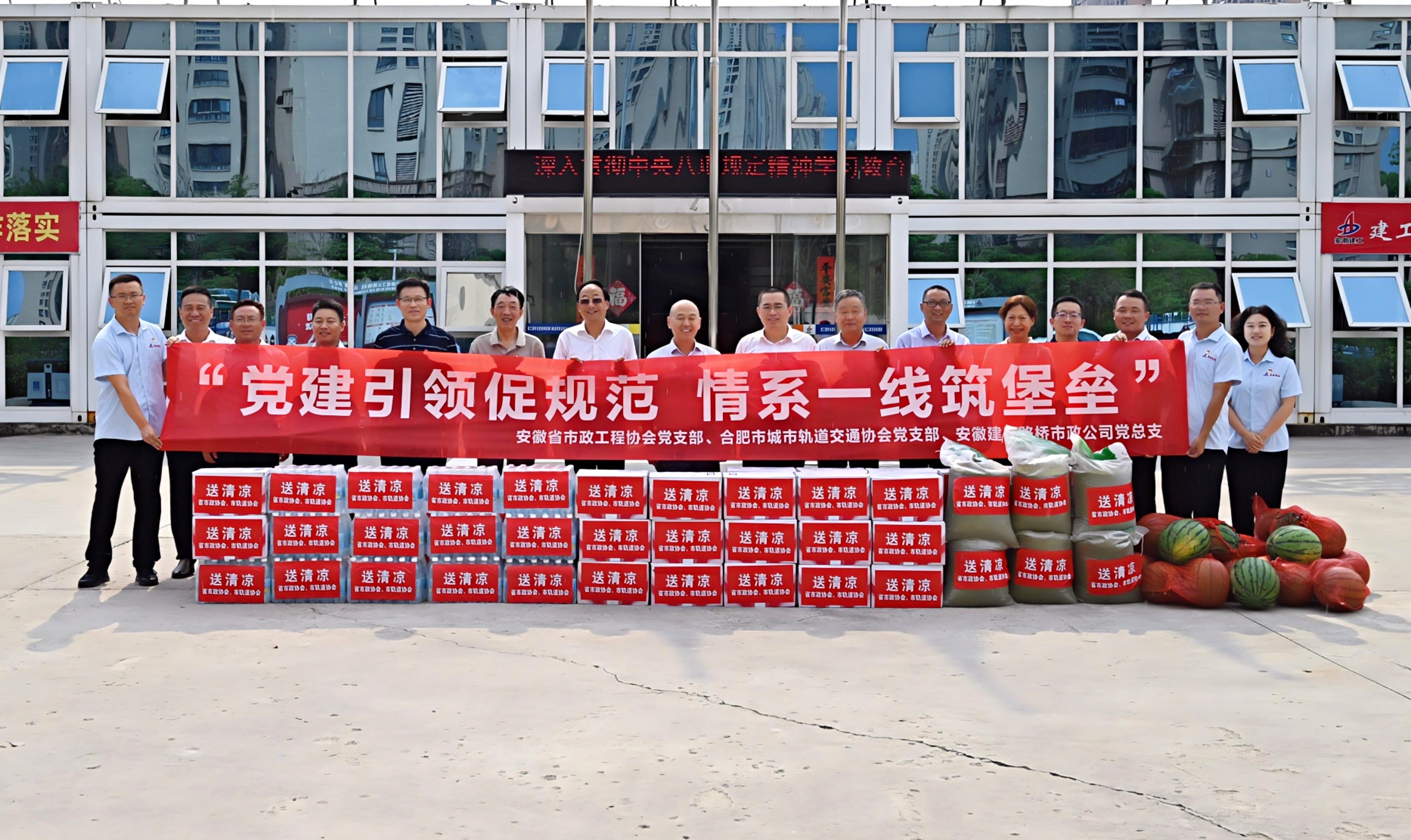 8月5号下午,安徽省市政工程协会党支部书记、会长王斌,合肥市城市轨道交通协会党支部书记、会长汪志成一行到合肥新桥机场S1线先行段项目开展“送清凉”慰问,向高温下坚守岗位的项目职工致以诚挚的问候和深切的关怀,嘱咐大家要科学统筹施工安排,落实防暑措施,在确保施工安全和工程质量的前提下,共同为如期完成目标任务努力。