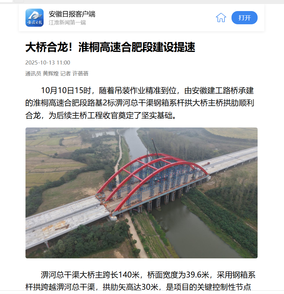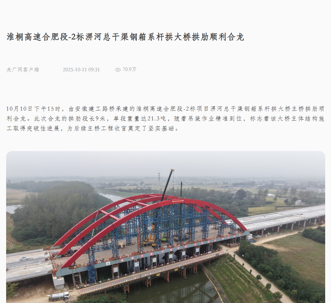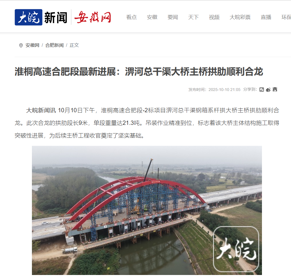 近日,央广网、安徽日报、安徽交通运输、大皖新闻等主流媒体聚焦报道淮桐高速合肥段路基2标淠河总干渠大桥拱肋合龙。