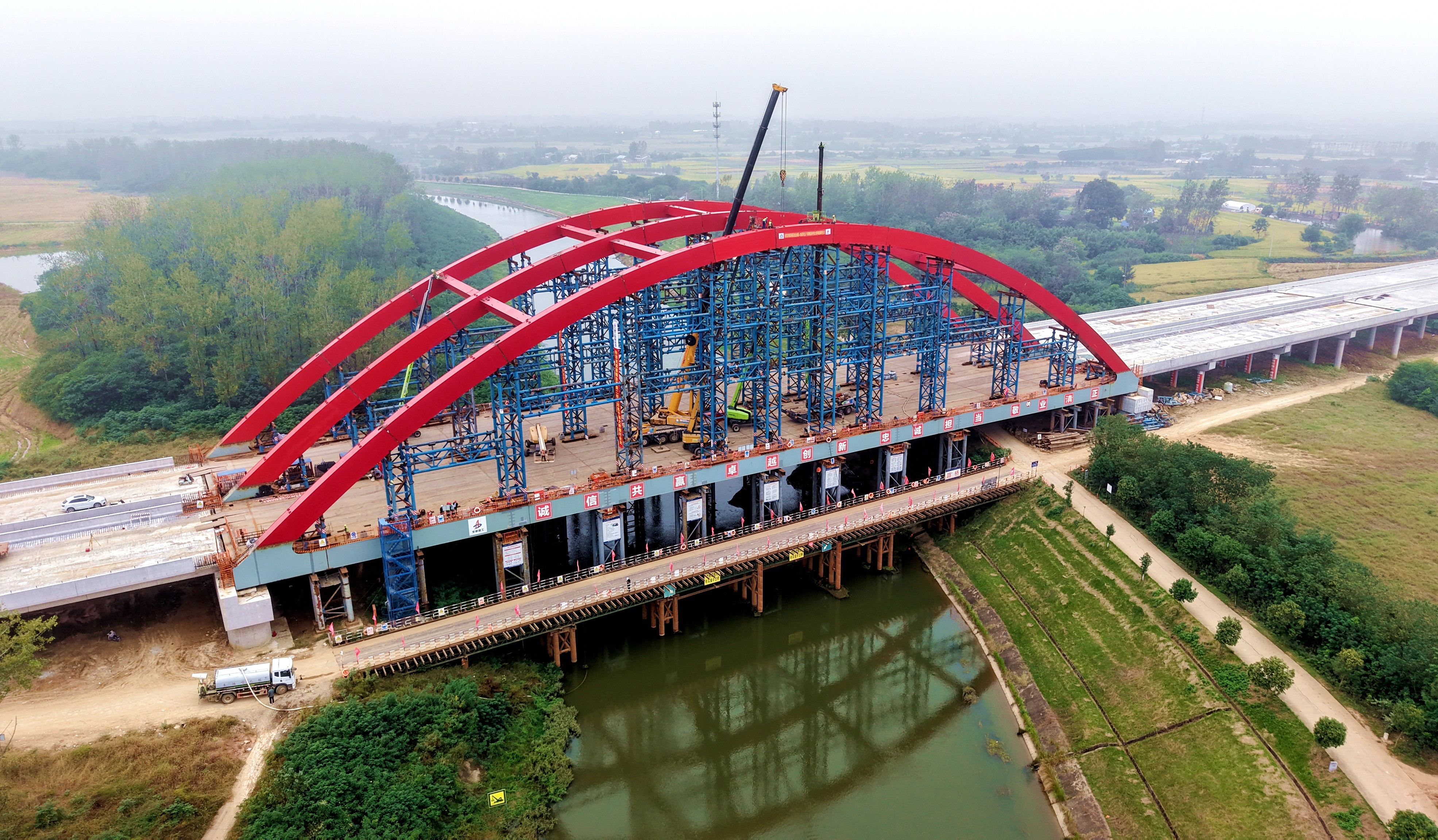 淠河总干渠大桥是项目关键控制性工程之一,主跨长140米,桥面宽39.6米,采用先梁后拱法施工。此次合龙的拱肋段长9米,单段重量达21.3吨,随着吊装作业精准到位,标志着该大桥主体结构取得突破性进展,为后续工程收官奠定基础。施工中项目部紧紧围绕质量、安全、环保等目标,结合温度监测合龙口参数,选择适宜时段实现高精度合龙。