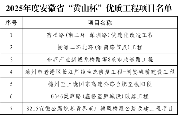 作为安徽省建设工程质量的最高荣誉奖项,“黄山杯”是全省工程建设领域质量标准的标杆,代表着行业顶尖水平与权威认可。此次获奖的7个项目既有服务区域经济发展的交通大动脉,也有关乎民生福祉的市政基础设施,不仅在工程质量、技术创新、绿色建造等方面表现突出,更在服务民生、推动区域发展中发挥了重要作用。