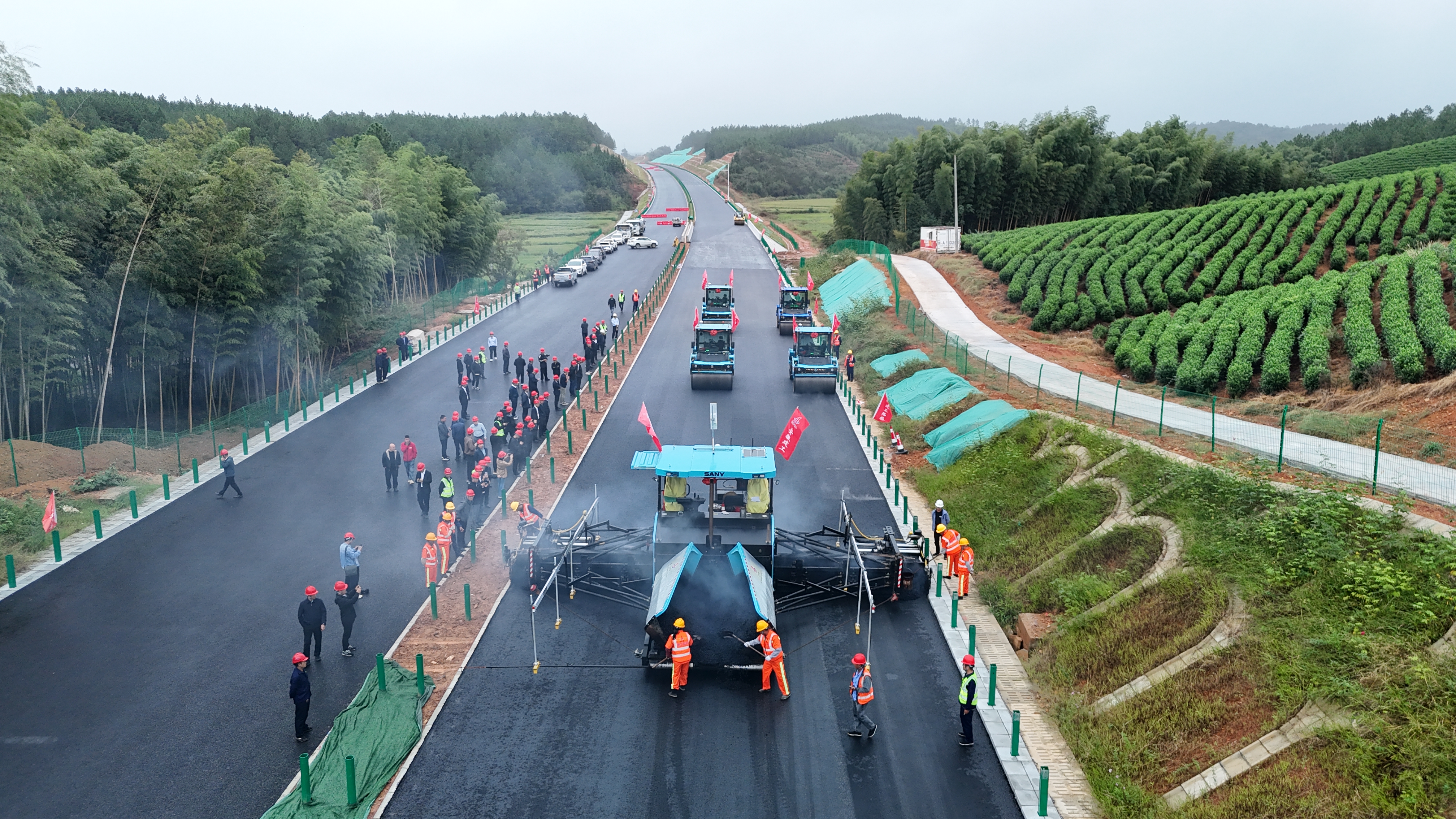 在泾青高速项目观摩现场,无人驾驶智能施工集群精准高效开展沥青上面层作业,成全场焦点。该智能施工系统针对高速公路长距离、高标准的建设需求,通过北斗高精度定位技术绘制三维“数字蓝图”,将道路平竖曲线、超高渐变段等关键参数精准导入控制系统,定位精度稳定保持在3毫米级,完美适配高速公路对路面平整度的严苛要求。观摩团随后前往泾青高速项目,考察沥青拌和站低碳节能生产实践。