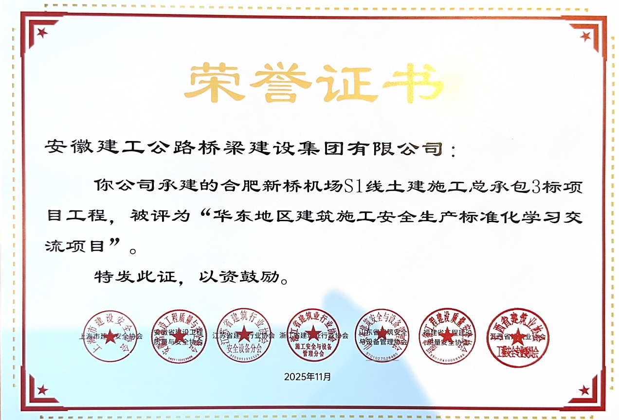 近日,华东地区建筑安全联席会公布了“2025年度华东六省一市建筑施工安全生产标准化工地学习交流项目名单”,公司承建的合肥新桥机场S1线土建施工总承包3标、合肥新桥机场S1线合肥西站枢纽先行段工程土建施工总承包项目光荣上榜。邵嘉兵、宋广辉获评优秀项目经理称号,李苏苏、段兴一获评优秀项目安全总监称号。