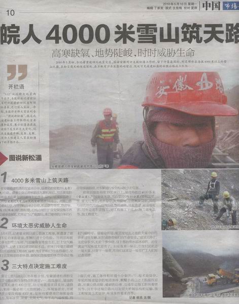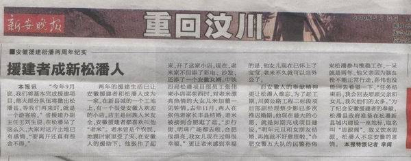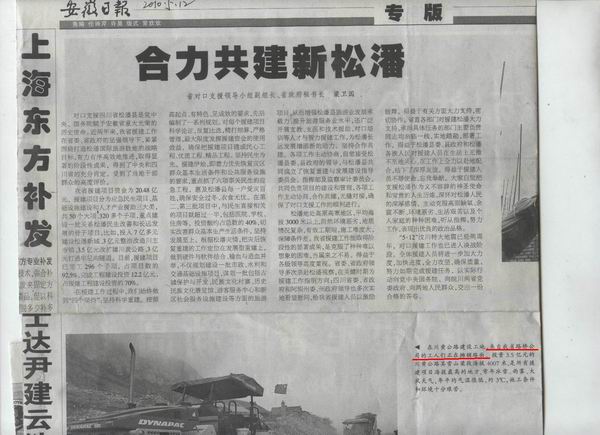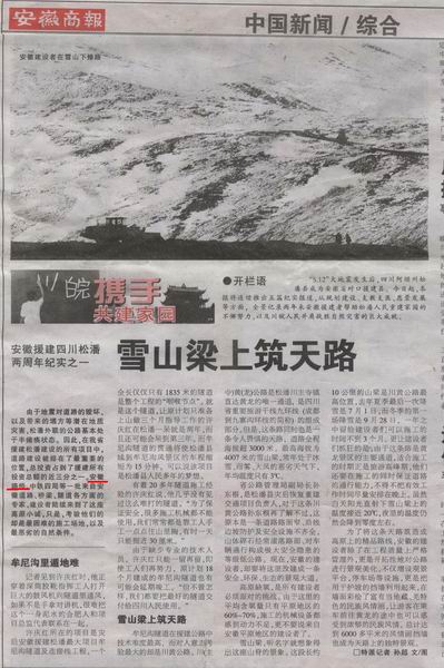 在“5.12”汶川大地震发生两周年之际,安徽省路桥公司承建的我省对口援建四川松潘县项目之一——漳黄公路道路改建工程02标再次引起省内各大主流媒体的高度关注。