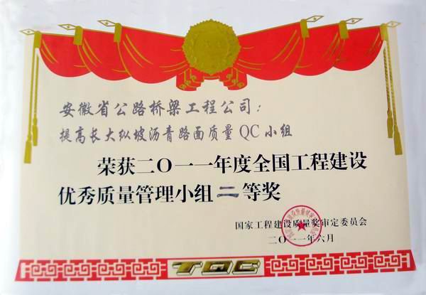 近日从杭州举办的2011年度全国工程建设质量管理小组成果发布会上传来喜讯,芜宣养护项目QC质量活动小组在此次成果发布会取得骄人成绩,经过最终评审,我部QC小组课题为《提高长大纵坡沥青路面质量》的研究荣获年度全国工程建设质量管理小组二等奖。