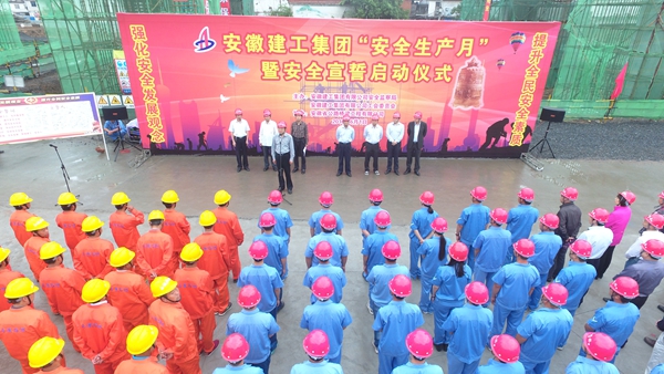 在集团公司工会主席徐晓光的带领下,所属各单位领导、安全管理人员,郎溪路项目全体管理人员及一线工人约200人举起右手,郑重宣誓:“我是一名安徽建工人,我郑重宣誓,时刻注意安全,遵守安全法规。履行安全职责,提高安全技能。杜绝三违现象,保证四不伤害。强化红线意识,促进安全发展。为了家人幸福、企业发展,誓做建工‘安全人’”。庄严的誓词久久回荡在项目现场,更加坚定了全体建工人“强化红线意识,促进安全发展”的信心和决心。