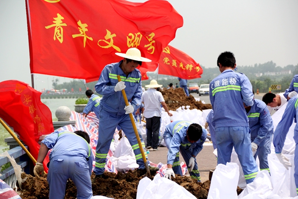 风雨同舟,众志成城。在抗洪抢险现场,党员突击队、青年突击队、工人先锋号、青年文明号……一面面鲜红的旗帜牢牢的树立在一线“战场”。公司领导班子成员亲临现场,靠前指挥,统筹谋划抗洪抢险方案,和全体员工并肩协同作战。在环湖大道上,近两千名员工分成多支作业队伍,分头推进,集中突破。在抢险队伍中,有不少刚刚加入公司的年轻人,他们肩扛手提,装袋、搬运、填筑,汗水浸透了衣服,实在干不动了,席地而坐或杵着铁锹稍作休息,随后继续投入战斗;一些已经奋战在一线几天几夜的老员工,顾不上身心疲惫,坚持留在一线,为年轻员工树立了榜样。从外地连夜赶来的支援队伍,来不及休息,迅速加入,配合突击,有力地推进了抢险进度。