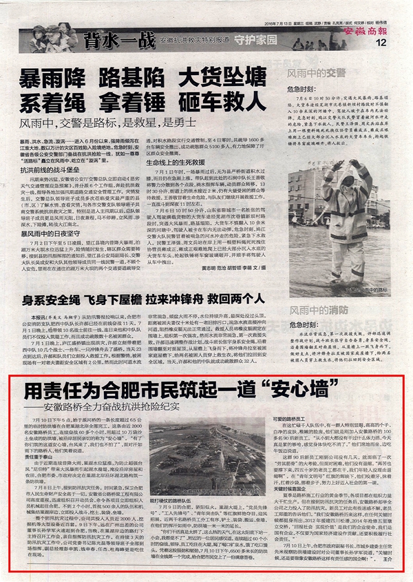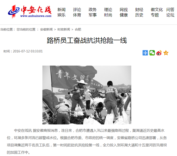 省级媒体聚焦公司抗洪抢险工作 发布时间:2016年07月13日 来源:党委办公室 发布人: 作者:王东 浏览:4499次 近日,公司积极响应合肥市委、市政府号召,全力参与环湖大道和十五里河抗洪抢险的事迹得到社会的高度关注。7月12日、13日,中安在线、《安徽商报》等多家省级媒体对公司抗洪抢险事迹进行了连续报道。