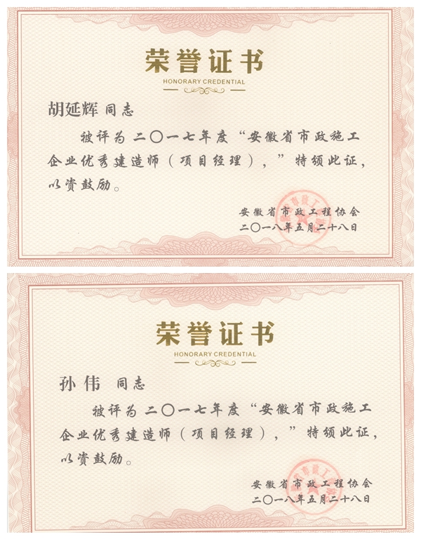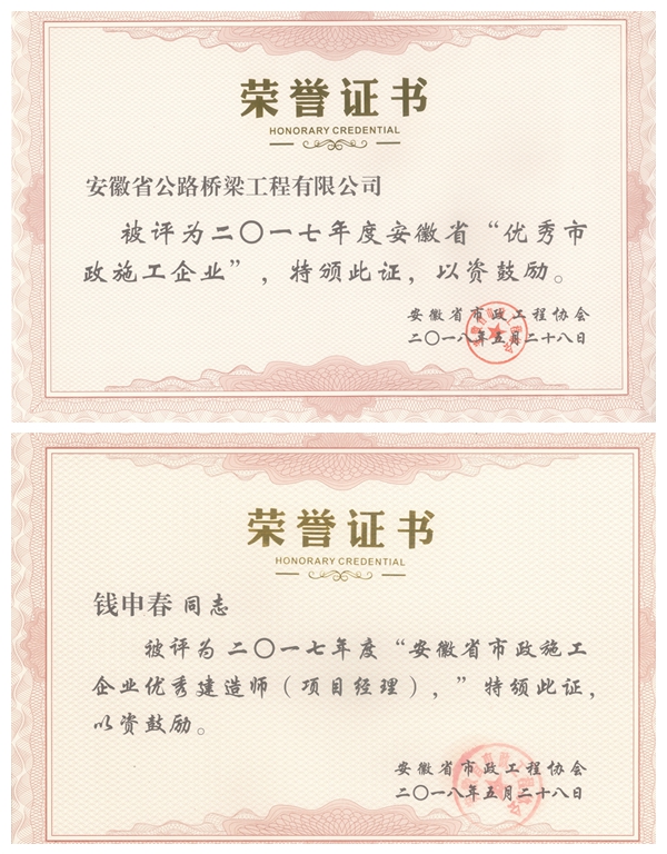 近日,从安徽省市政工程协会传来喜讯,公司荣获2017年度安徽省“优秀市政施工企业”荣誉称号,钱申春、胡延辉、孙伟三位同志荣获2017年度安徽省“市政施工企业优秀建造师”荣誉称号。