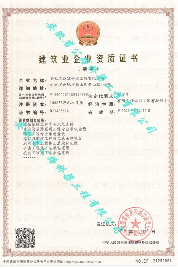 近年来,公司不断丰富企业资质,提高已有资质等级,增加新业务资质,提高企业核心竞争力,扩大市场参与面,由传统的单一交通基础设施施工企业向多元化、宽领域建筑的方向转变,努力实现打造省内龙头、国内知名总承包施工企业的奋斗目标。