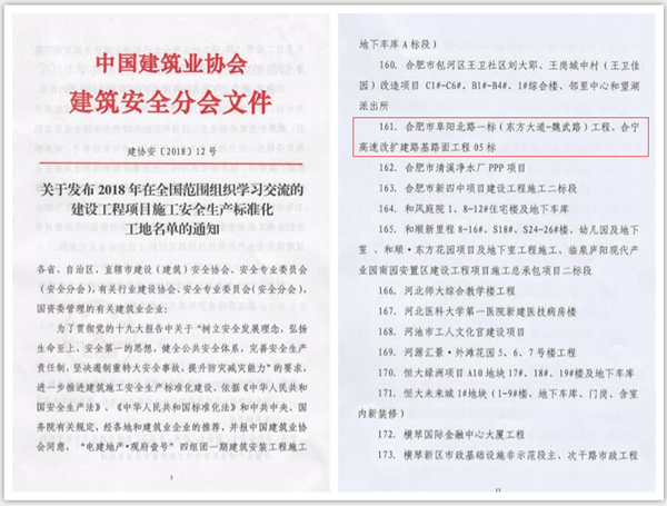 近日,从中国建筑业协会建筑安全分会传来喜讯,公司承建的阜阳北路高架01标和合宁高速改扩建路基路面工程05标两项工程荣获“2018年全国建设工程项目施工安全生产标准化工地”荣誉称号。