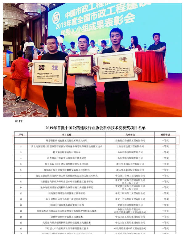 近日,从中国公路建设行业协会、中国市政协会获悉,由市政分公司申报的《矮塔斜拉桥成套施工关键技术研究及应用》项目荣获2019年首批中国公路建设行业协会科学技术奖一等奖;市政分公司QC攻关小组成果分别摘得一等奖2项、二等奖3项、三等奖2项,公司再次荣获“全国市政工程建设QC小组活动优秀企业”荣誉称号。