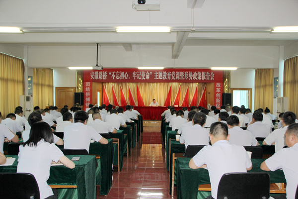 为进一步推深做实“不忘初心、牢记使命”主题教育,按照公司主题教育方案部署,8月2日下午,股份公司副总经理、公司党委书记、董事长孙学军以“守初心 担使命 找差距 抓落实——用习近平新时代中国特色社会主义思想指导打造品质路桥卓越路桥”为主题,作了一场主题教育党课暨形势政策报告会。集团主题教育第四指导组副组长王永来到会指导。公司领导,中层干部,在肥项目经理、党支部负责人,机关全体党员100余人参加了报告会。