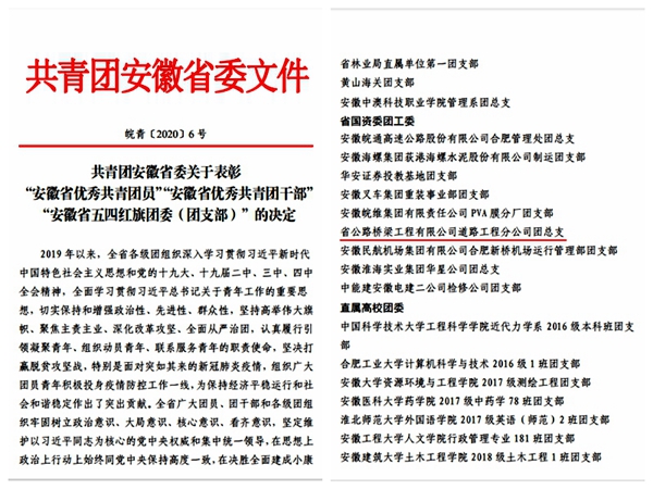 道路分公司团总支荣获“安徽省五四红旗团总支”称号