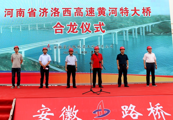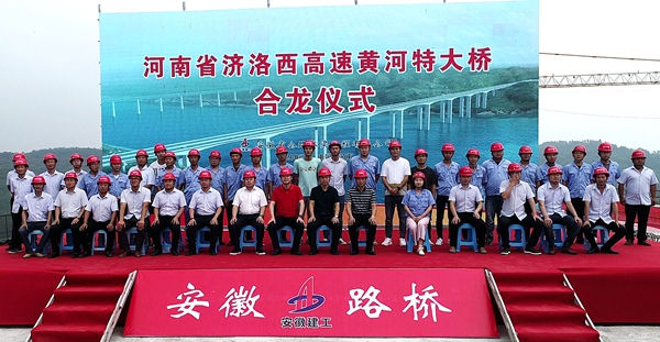 7月26日下午,公司承建的济洛西高速黄河特大桥顺利举行合龙仪式。济洛西高速公路建设有限公司董事长杨新民宣布黄河特大桥正式合龙,股份公司党委副书记、副总经理孙学军,河南省收费还贷中心工程处副处长赵翔,股份公司工管部副部长葛辉,公司党委委员、副总经理任杰出席仪式。