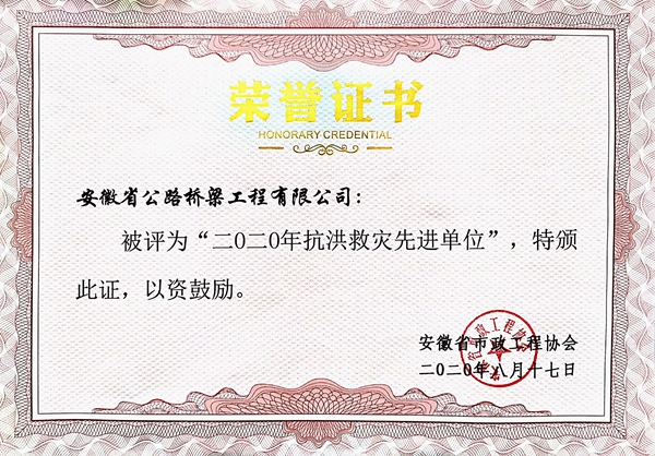 近日,安徽省市政工程协会发布《关于表彰2020年抗洪救灾先进单位的决定》,对今年6月以来积极投身抗洪救灾一线表现突出的会员单位进行表彰。公司获评“2020年抗洪救灾先进单位”。