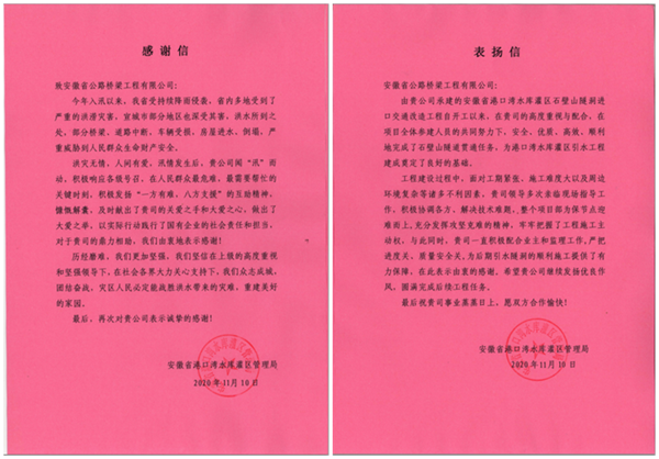 近日,由安徽路桥公司承建的宣城市宁国港口湾水库灌区石壁山隧道进口交通改造工程获安徽省港口湾水库灌区管理局来信感谢,对公司在入汛时发挥国企担当、积极抗洪抢险,安全、优质、高效完成石壁山隧道进口交通改造任务表示感谢。