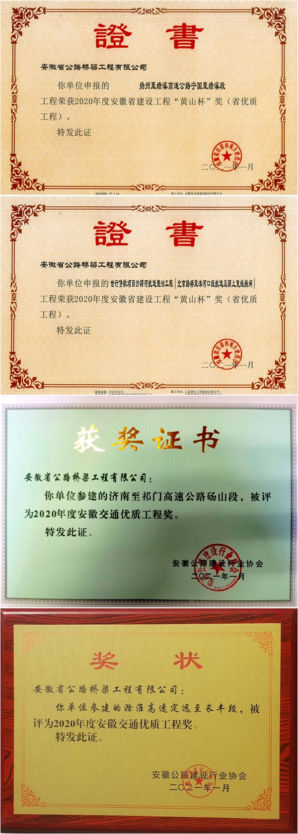 近日,2020年安徽省建设工程“黄山杯”和2020年度安徽交通优质工程奖在合肥颁奖。公司承建的扬绩高速公路宁国至绩溪段路基07标、沙颍河航道(北京路桥至沫河口段航道及颍上复线船闸)整治工程06标荣获2020年安徽省建设工程“黄山杯”。滁淮高速公路定远至长丰段路基05标、路面02标,济祁高速砀山段项目荣获2020年度安徽交通优质工程奖。