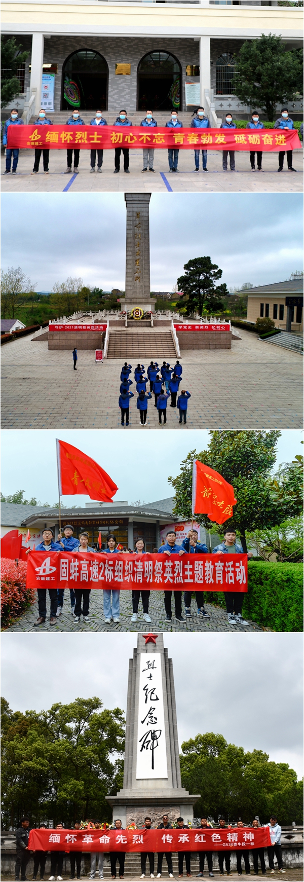 蒙城PPP项目党支部组织党员和职工来到蒙城县革命烈士陵园扫墓祭奠,向革命烈士敬献花篮,表达哀思;淮北片区党支部组织党员、团员青年和职工瞻仰泗县烈士陵园,铭记历史,致敬革命先烈;合肥轨道交通3号线南延2标项目党支部前往新四军江北指挥部开展党史教育,重温入党誓词,牢记初心使命;引江济淮联合党支部追寻红色足迹,在茶壶山烈士陵园纪念碑前,唱响国歌,静思默哀;畅通二环(西南环)项目党支部组织开展“网上祭英烈”活动,广大党员、团员青年和职工登陆网上纪念馆,缅怀革命先烈,表达对英雄的敬意。