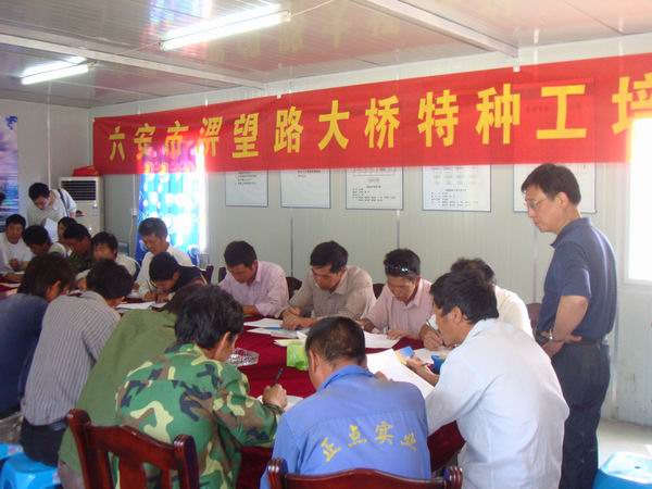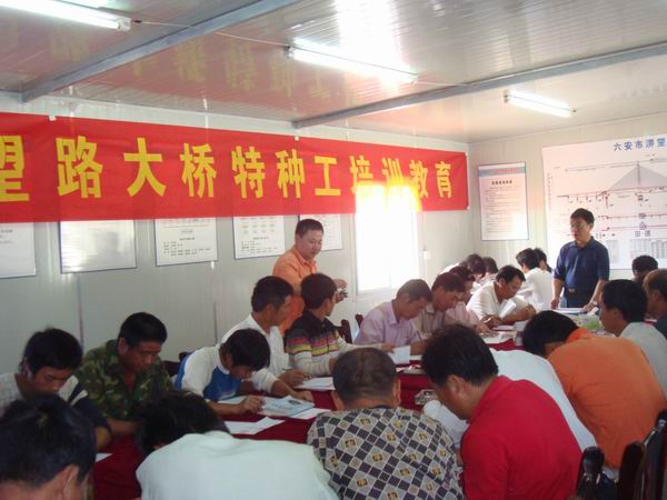 为进一步加大项目部安全生产培训教育力度,切实提高特种作业人员的安全素质和安全操作技能水平,确保在岗特种作业人员100%持证上岗。淠望路大桥项目部在公司人力资源部的指导和帮助下,以“安全生产月活动”为契机,于6月3日至4日,组织了一期特种作业人员上岗培训和复审培训再教育活动。邀请了省安监局特种作业培训中心的老师直接来到一线,对项目部及各下属作业队的电工、焊工、起重工等特种作业人员进行安全技术培训,培训的主要内容有特种作业人员安全生产法律法规知识、安全生产管理知识、安全技术理论知识等。
