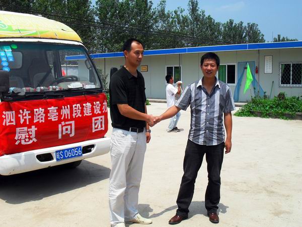 安徽交投集团泗许高速亳州段建设办到泗许01标慰问 发布时间:2009年07月29日 来源:泗许01标 发布人: 作者:章玉洁 浏览:5320次 连日来,持续高温,7月24日上午,交投集团泗许高速亳州段建设办综合部部长王文飞一行带着绿豆等防暑慰问品,冒着烈日来到泗许项目01标进行慰问,让我标段的所有员工在高温一线倍感清凉。