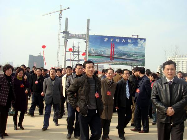 在大桥南端,代表委员们听取了业主负责人六安市建委副主任曹德林关于大桥的相关介绍。当曹主任介绍到自2009年2月1日开工以来,项目部紧紧围绕工程目标,编排工期、制定方案,狠抓落实;全体员工凝心聚力、攻坚克难,确保各项目标任务顺利完成,预计4月初主跨即可合拢时,代表委员们不由地惊叹起来。
