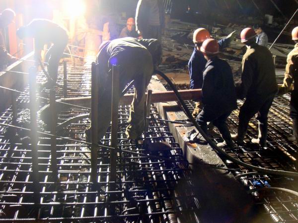 淠望路大桥主桥全长120米,共有15个节段,是整个大桥的重难点和关键控制性工程,全部采用前支点挂篮施工。由于施工技术含量高、施工难度大,关系到全桥的进度与形象,是全桥施工的重中之重。开工伊始项目部就高度重视,提出了“向主桥要进度、向引桥要形象”的口号;多次组织专家评审施工方案、优化施工工艺,特别是“塔梁并进”工艺的采用,极大地促进了工效,既缩短了工期又降低了成本。随着工程的推进,项目部审时度势的不断优化整合施工资源配置:在施工力量、机械设备上优先满足主桥施工需要。在抢时间赶进度的同时不断强化现场安全生产管理,并严把质量关,特别是会同监控单位加强了对整桥线形控制,使之符合设计和施工技术规范要求,达到了预期效果。在工序无间隙、昼夜无间断,质量有控制、安全有保障的良好状态下,以七至八天每节段的速度全力推进主桥建设,圆满的完成了主桥建设的各项任务。