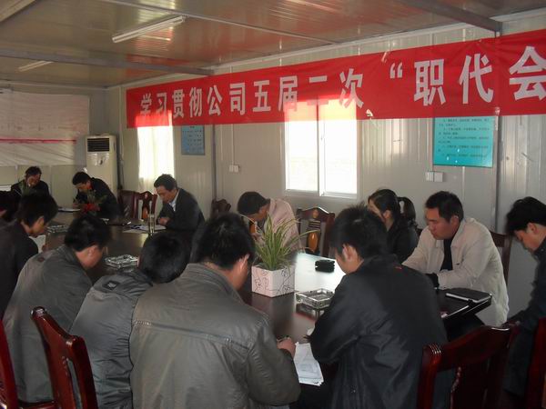 会上,项目经理杜海峰先向大家传达了此次职代会的精神,并带领大家认真学习了公司总经理汪卫东在职代会上的工作报告——《夯实管理基础,拓展发展空间,为推动安徽路桥快速发展而努力奋进》。报告求真务实,目标明确,全面回顾了2009年的工作,硕果累累,令人欢欣;又周密部署了2010年的新任务,振奋人心,鼓舞士气。