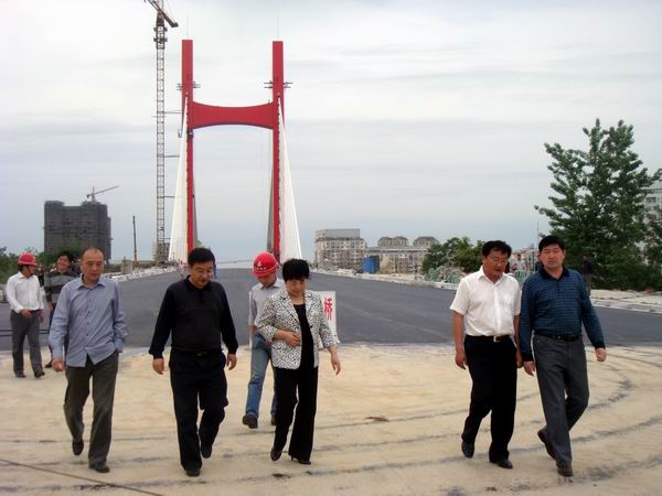 朱红的索塔雄伟绚丽,扇状的斜拉索似一双巨大而洁白的羽翼,刚摊铺好沥青的桥面黑亮宽敞而又整洁顺畅……远远望去整个大桥气势恢宏、身姿优美,似长龙横卧,如彩虹飞架,在蓝天白云、碧波绿水的映衬下显得格外的雄伟壮丽。李乔书记对大桥壮丽的景色表示满意,并对我部保质保量如期圆满的完成大桥主体工程施工予以了充分肯定和赞许,并勉励项目部乘势而上,做好大桥后续收尾工作。