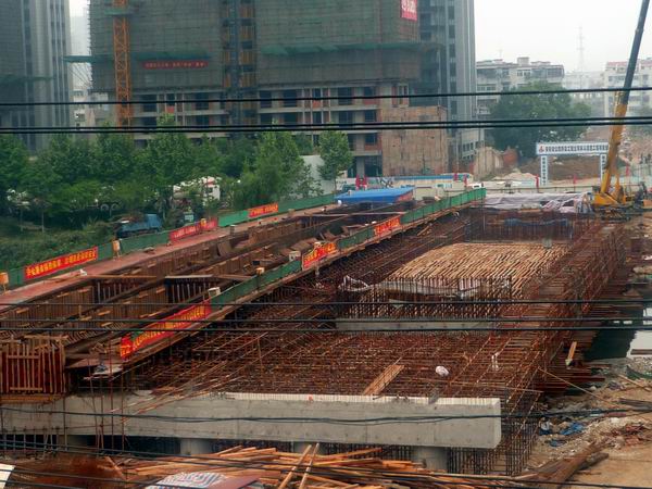 宋斗湾路工程跨南淝河桥在3月30日左半幅钢管桩打设完毕后,就开始着手进行贝雷架和支架搭设作业。在左半幅支架搭设、模板铺装和钢筋安装施工的同时,跨南淝河桥右半幅的钢管桩打设作业和支架搭设作业也初步完工。至此,宋斗湾路工程跨南淝河桥的上部结构的支架搭设基本完工。下一步,箱梁内膜安装结束后,项目部将组织桥梁主体混凝土浇注工作。