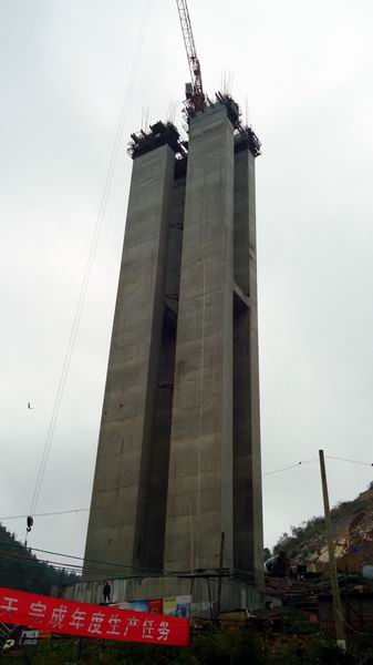 岩子脚特大桥为连续性刚构桥,两主墩之间跨度160米。主桥左、右幅均为混凝土连续箱梁,是水盘线几个重点控制工程之一,也是影响我项目工期的关键性工程。该桥主体桥墩都有4根墩柱,高度均超过58米,此次完成封顶的主桥4号墩是迄今为止我公司施工过的最高桥墩。