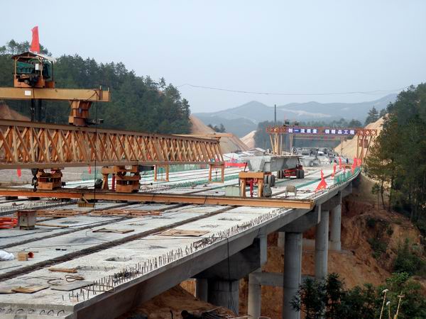 站塘高架桥位于会昌县站塘乡,中心桩号问为K1498+450。大桥全长135米,共5跨,上部结构为连续预应力箱梁。10月5日,站塘大桥开始架设第一片箱梁,经过一个多月的努力施工,终于全幅贯通。