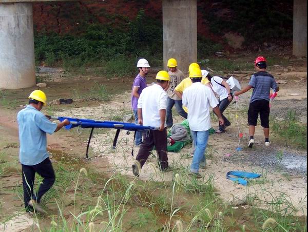 接下来,对参演人员进行角色分工和任务分配。所有参加演练的人员来到项目正在进行的30米箱梁预制场门架附近待命。4点钟,演练行动正式开始。项目负责人接到报告,K11+300水阳江1#桥面施工区域发生高坠事故。由于水阳江桥施工现场地处偏远,距离主干道路和项目部及医院都较远,给自救和救援带来严重考验。抢救疏散组及时启动《高坠事故应急救援预案》,在以项目经理为主的事故应急救援领导小组领导下,各事故应急救援机构各司其职。抢救疏散组立即组织抢救受伤人员,将汽车、设备、救护人员派到事发地点,并对现场人员进行疏散隔离。救护人员第一时间对高坠伤者进行了初步检查,判定伤者暂时没有生命危险,并对其发生骨折的右上肢进行了夹板保护,在抢救疏散组的协作下,伤者立即通过担架进行转移,送往医院。