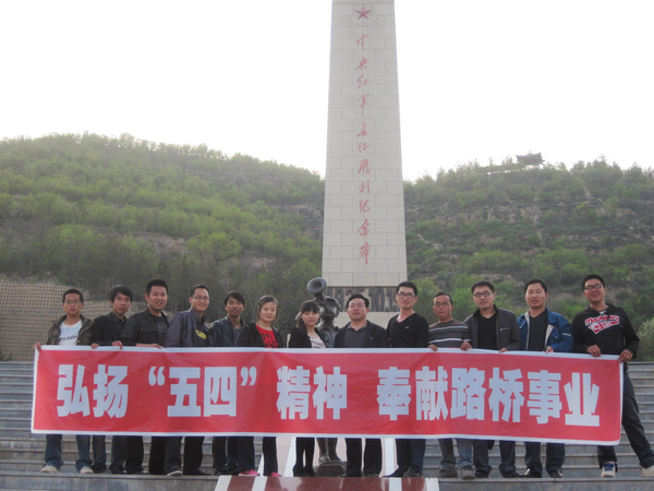 为不影响施工生产,活动选择在下午6点进行。项目经理带领全体青年团员前往吴起县中央红军与陕北红军会师地吴起县中央红军革命纪念园,接受红色教育。项目部全体青年团员顺着革命先辈踏过的台梯,一步步的登上中央红军长征胜利纪念碑的脚下,共同拉着“弘扬五四精神奉献路桥事业”的宣传标语进行合影留念。