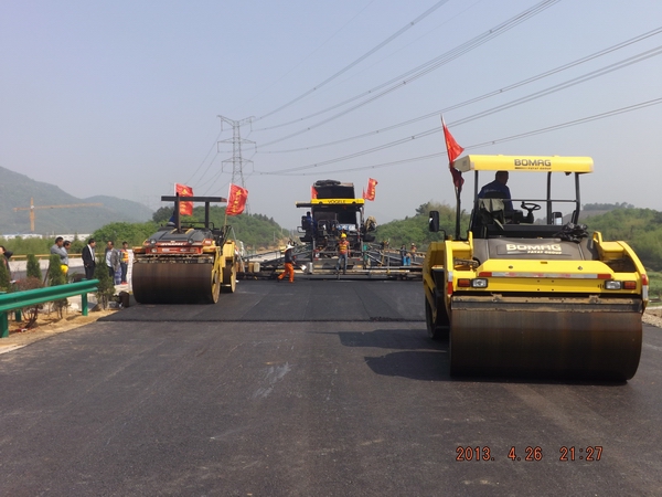 为保证此次试验段摊铺顺利进行,项目部于4月25日晚召开专项会议,对各施工班组及机械操作人员进行详细的技术、安全交底,对整个施工过程的各个环节进行了详细确认,将责任、要求细化到个人。会议强调在施工过程中要严把质量关,沥青出场温度、到场温度、摊铺温度、初压温度、复压温度、终压温度等相关指数均要在设计范围内,同时,安全保障措施等也要控制到位。