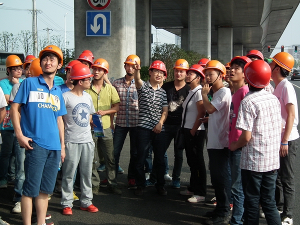 下午15:00,在项目部会议室,该项目总工利用PPT图文并茂的给学生们介绍了阜阳北路高架工程概况、施工工艺、工程质量控制。随后,学生们来到施工现场,该项目总工将学校中学习到的理论知识与现场施工实际相结合,对阜阳北路高架桥梁的整个施工工艺流程作了深入浅出的讲解。